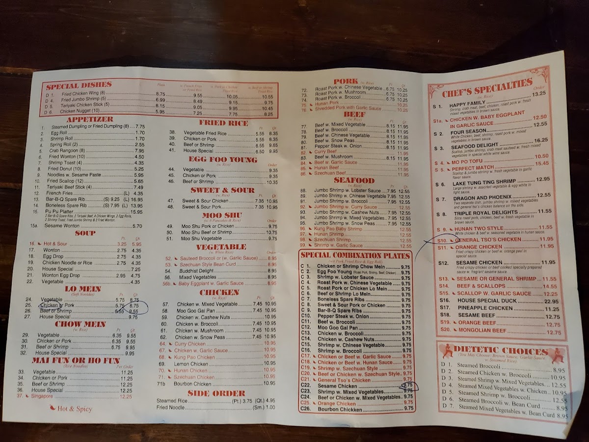 Number One Restaurant offers a wide range of dishes, making it an excellent choice for diverse tastes. The Special Dishes menu features favorites like Fried Chicken Wing and Fried Jumbo Shrimp, along with Teriyaki Chicken Stick and Chicken Nugget. For appetizers, guests can enjoy options such as Steamed Dumpling or Fried Dumpling, Egg Roll, Shrimp Roll, Spring Roll, and Crab Rangoon. Their Lo Mein and Mai Fun dishes come in various choices, including Vegetable, Chicken, Pork, Beef, and Shrimp, as well as the flavorful House Special versions. The Fried Rice section offers dishes like Vegetable Fried Rice, Chicken or Pork Fried Rice, and Beef or Shrimp Fried Rice, with a delicious House Special variation. Vegetarians will appreciate the selection of Sautéed Broccoli, Szechuan Style Bean Curd, Buddhist Delight, and more. For those craving something tangy, there are Sweet & Sour Chicken and Sweet & Sour Pork options. The Chicken dishes include classic choices like Chicken with Mixed Vegetables and Moo Goo Gai Pan, as well as Chicken with Cashew Nuts and Chicken with Broccoli. Meat lovers can savor Beef with Mixed Vegetables or Pepper Steak with Onion. The Special Combination Plates provide an array of options, including Chicken or Shrimp Chow Mein, Egg Foo Young, and Shrimp with Lobster Sauce. Chef's Specialties like Happy Family and Seafood Delight add a unique flair, while Dietetic Choices cater to health-conscious diners with steamed dishes like Steamed Shrimp with Mixed Vegetables and Steamed Broccoli. Finally, for a comforting start, guests can choose from soups like Hot & Sour or Wonton. With a varied menu, Number One Restaurant has something for everyone.